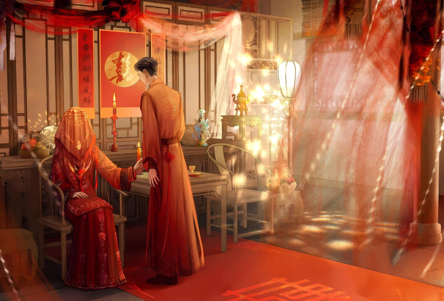 White matters are sorrowful, red matters are joyful,I shall pass from the mortal realm to the underworld,Joss candles, paper horses, bridal sedan chair, Meng Po1 bears witness to our union.White paper and red robes, the suona2 sounds for tens of miles—together in life, together in death.